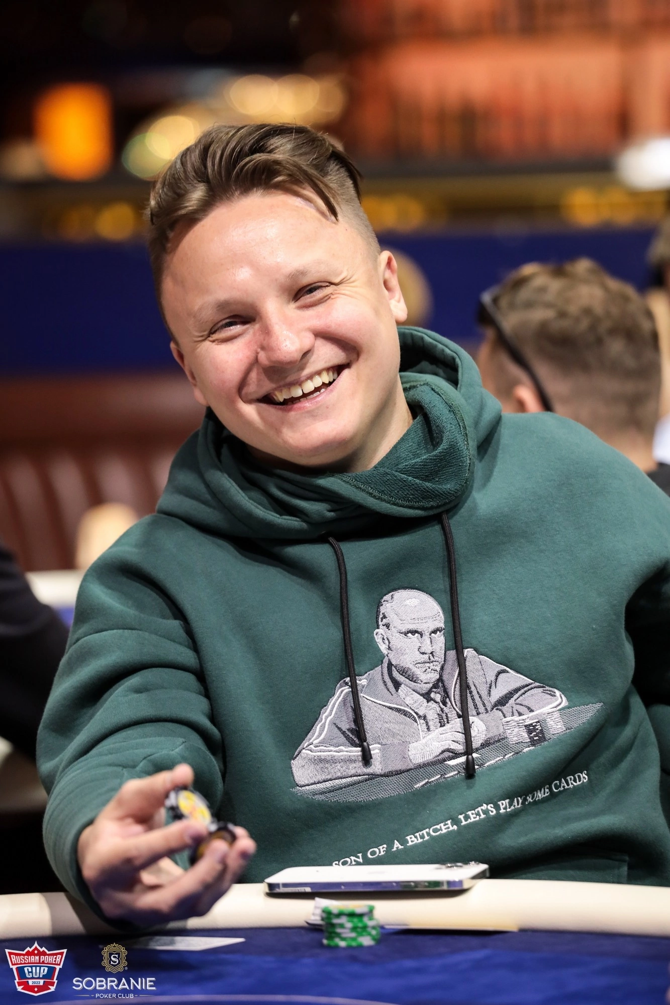Богдановский сначала перевернул , и Деменков уже приготовился к тому, чтобы макнуть свою руку. Но второй картой была не трефа - .