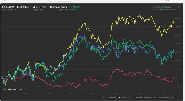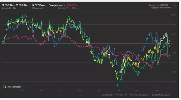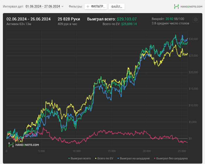 Набрали 20к недобора в копилку, в среднем 25к рук в месяц. Хотелось около 100к сыграть, но как есть. Учитывая мое ебаное ленивое состояние всю весну+много отдыхал, думаю в целом нормальный результат. Линии вроде в норме(кроме зеленой), поэтому переживать не стоит.