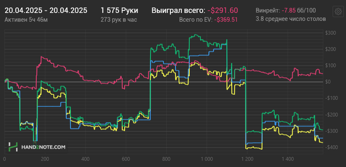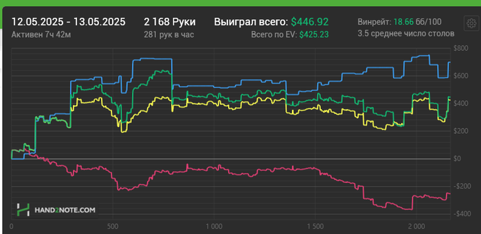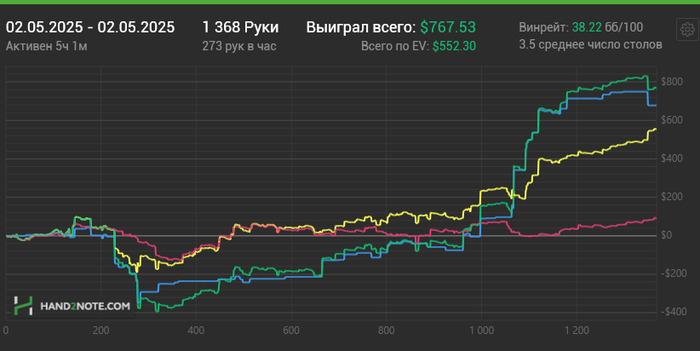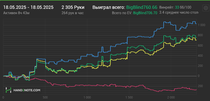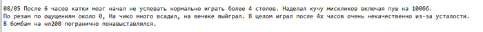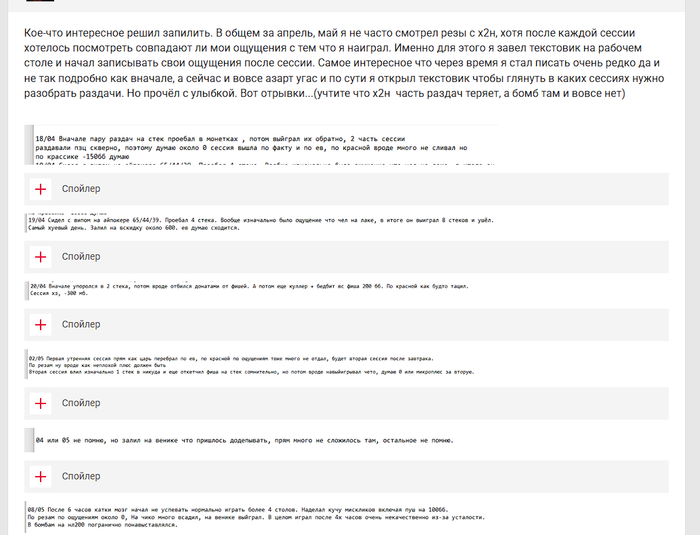 Кое-что интересное решил запилить. В общем за апрель, май я не часто смотрел резы с х2н, хотя после каждой сессии хотелось посмотреть совпадают ли мои ощущения с тем что я наиграл. Именно для этого я завел текстовик на рабочем столе и начал записывать свои ощущения после сессии. Самое интересное что через время я стал писать очень редко да и не так подробно как вначале, а сейчас и вовсе азарт угас и по сути я открыл текстовик чтобы глянуть в каких сессиях нужно разобрать раздачи. Но прочёл с улыбкой. Вот отрывки...(учтите что х2н часть раздач теряет, а бомб там и вовсе нет)