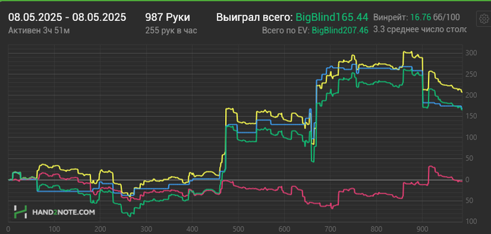 2)сложные сессии - я хочу их глянуть сразу же после сессии, тк мне нужно не забыть разобрать их первостепенно в выходные. Глянуть на красную линию, если сильно падает вниз значит есть вероятность что в каких то спотах меня много переигрывали, и нужно тщательнее перепроверить раздачи.