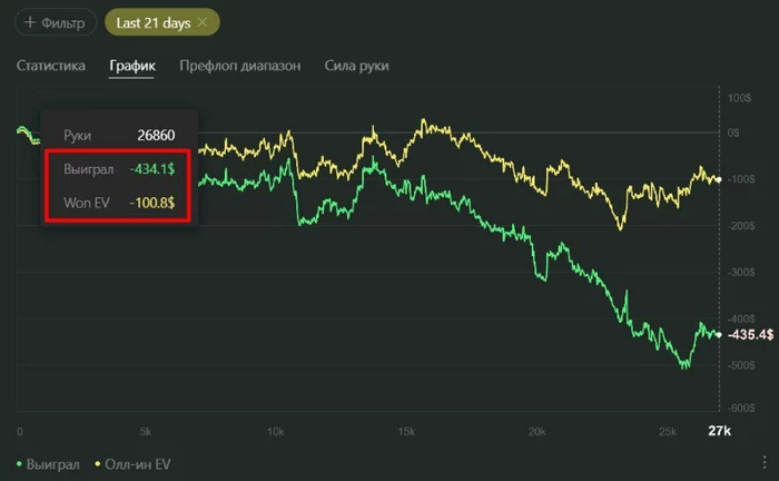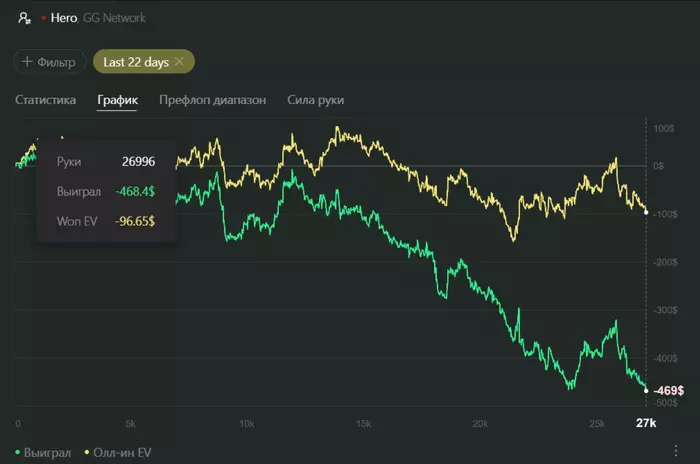 Такого у меня давно никогда не было. 15 стеков недодачи на регстолах за 27К рук - кмк, многовато.