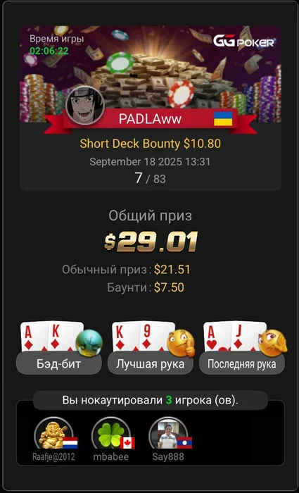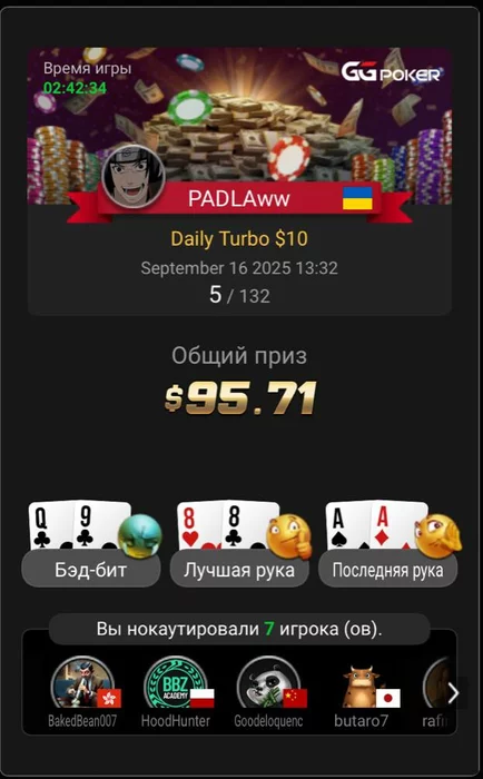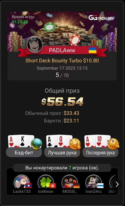 Так, а еще 4 турнира? -Там то другая песня. Я играл настолько широко и неаккуратно, ибо уже был тильт, что в моменте у меня на одном столе оказалось х25 стартовых(что хватало, в обрез, на финальный стол). Но там игра была дефолт🤡: 99ки? - алл-ин, AJ? - алл-ин. QJs на МБ? тоже АЛЛ-ин. Я просто пихал все чтоб поскорей вылететь. Таким образом ИТМнул 2а стола из 4х, и сразу же 250к фишек раздал за пару раздач: с А7s Q9 A5 - картонки с котороми по хорошему в той стадии вообще не следовало б заходить, тем более в позе которой я находился. Имея проходной стек на финалку можно было б просто посидеть, но ... 17е место. Утешительные идут в фонд шордека 😶