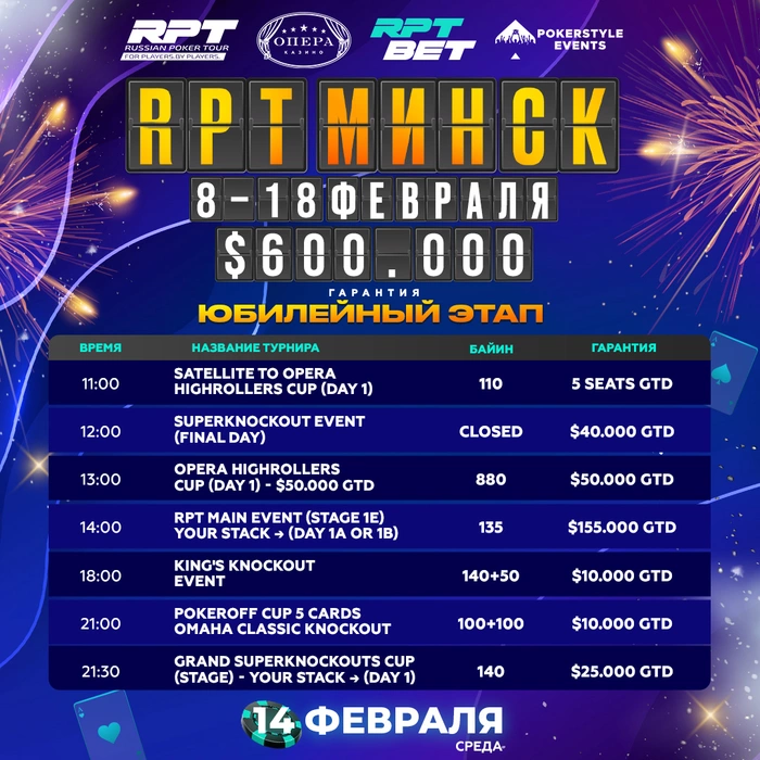 ❤️ 14 февраля — великолепный день, чтобы вспомнить, насколько сильно мы влюблены в покер! День, который можно провести в компании единомышленников за любимой игрой. И в расписании вновь 7 турниров на любой вкус, а вечером можно вместе со своей половинкой отметить день влюбленных на традиционном караоке-баттле. 😍