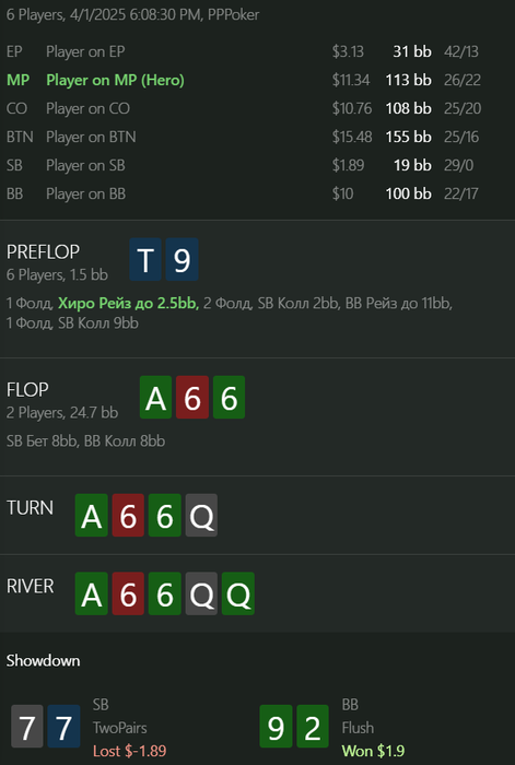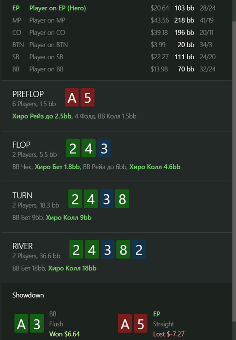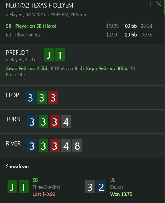 Флоп: радуга. Опп ставит треть я рейжу он дает 3бет. С чем может быть 3бет у такого оппа. Блефов думаю никогда нет. И диап вижу как оверпары, возможно и ТПТК, сеты, допера. На момент раздачи дисконтировал сет дамм.