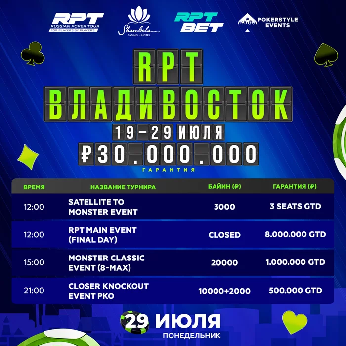 Также в 12:00 соберутся 18 участников финального дня RPT Main event. Чипкаунт и рассадка.