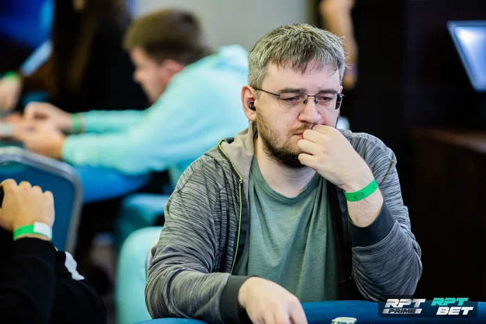 Владислав все же решил добывать фишки классическим способом. Съездил префлоп с в Евгения Шульженко за банк около 100к. Аутов у Владислава было очень много, но ничего так и не доехало: