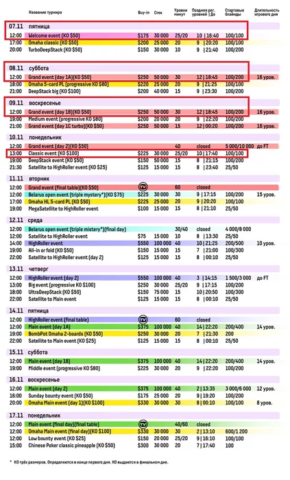 С 5 по 11 ноября планирую посетить серию БПТ в Минске. Буду играть отмеченные турниры, но если кто-то желает бэкнуть на другие турниры серии - пишите в ЛС. По ожиданию один из лучших для меня турниров по ПЛ Омахе Х-Л за 225$ будет 11 ноября. Останусь сыграть его, если продам. Ну и дальнейшее расписание могу отыграть, если продам доли. Подробности в ЛС.