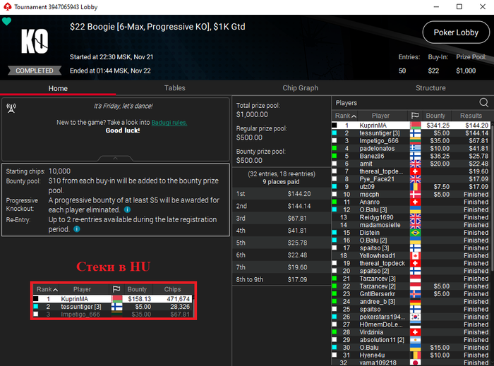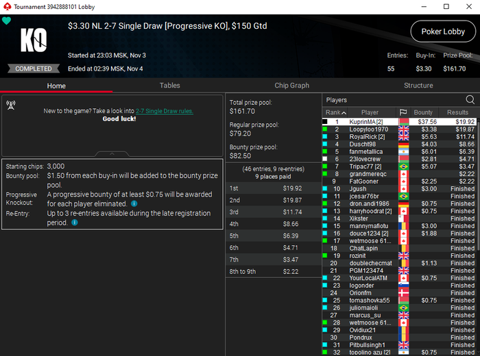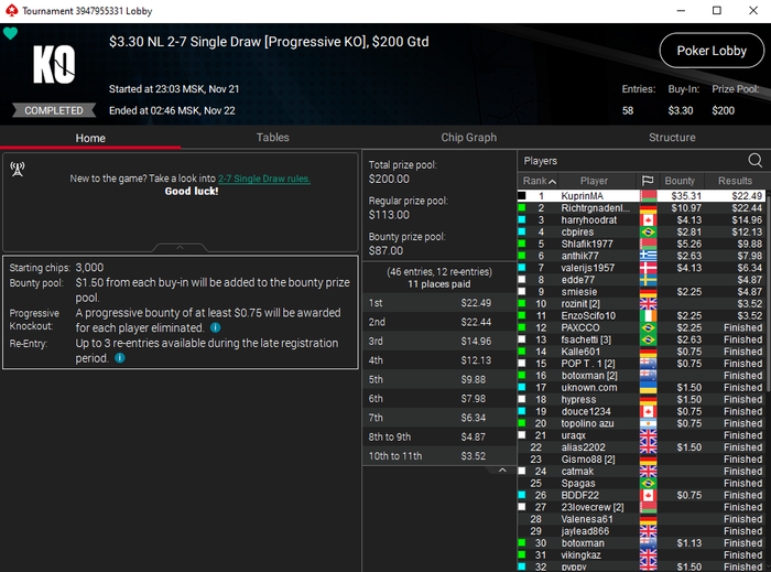 Ну и ещё умудрился выиграть вечерний лоуболл, хотя запрыгнул в него на последних минутах лейт реги и играл его просто фоном. За серийный лоуболл конечно очень неприятно, VIP там получил огромный стек, но всё равно занял только 7-ое место. Я бы конечно уже вряд ли упустил победу, если бы устоял в той раздаче.