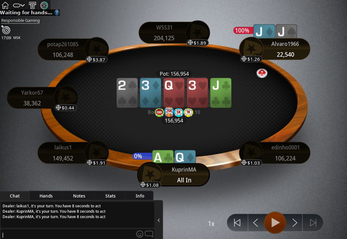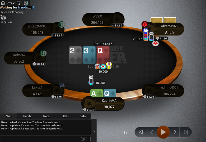 Раздача с сегодняшней предфиналки по холдему. Собственно, на скрине всё видно. Оппонент пирожок, за последние 5 минут опен-пушит такими сайзами уже около 7-8 раз. Идёт прямой баббл финалки. Наши действия?