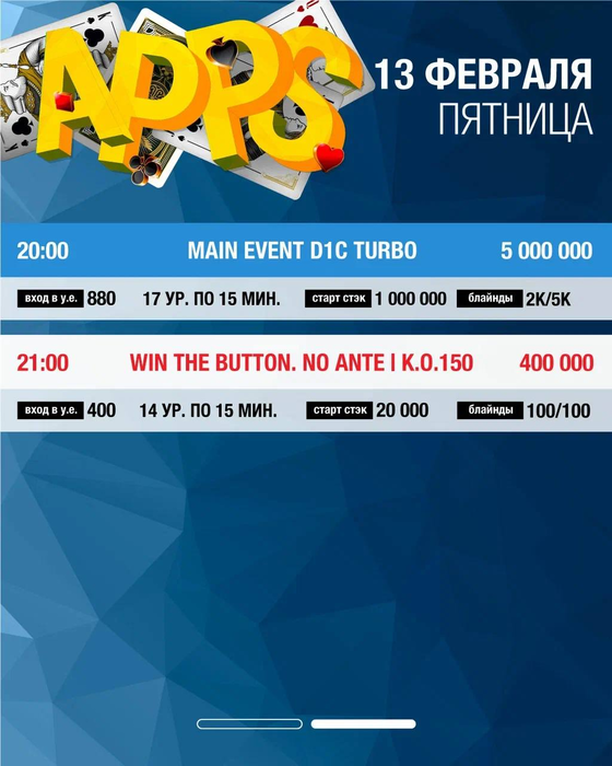 🤩Дни 1В и 1С Main Event 🤩Второй день Highroller 🤩Однодневный Win The Button 🤩А между ними еще и степы к каждому из перечисленных турниров.