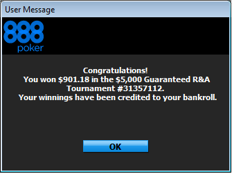 По итогу занял 4 место в недорогом турнире с большими анте, если коротко, то играл хорошо, но не складывалось ) В любом случае думаю, что это неплохое начало.