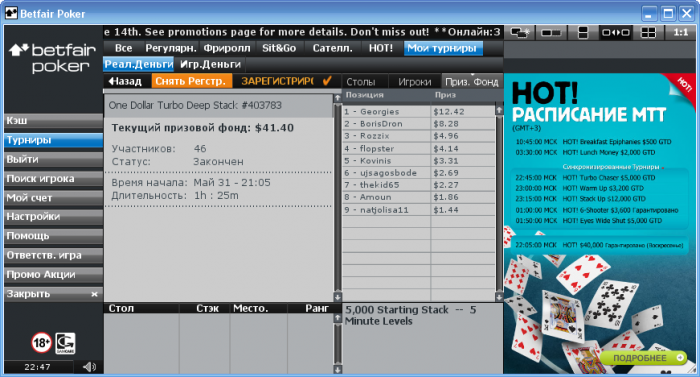 Сейчас нарыл на бетфейре 8$ и решил поле посмотреть... Зарядил 1$ в турнир и фриролл(250 тел)... Поле показалось гораздо слабей церуса ))) В фриролле 10 место... В турнире за 1$ вот :