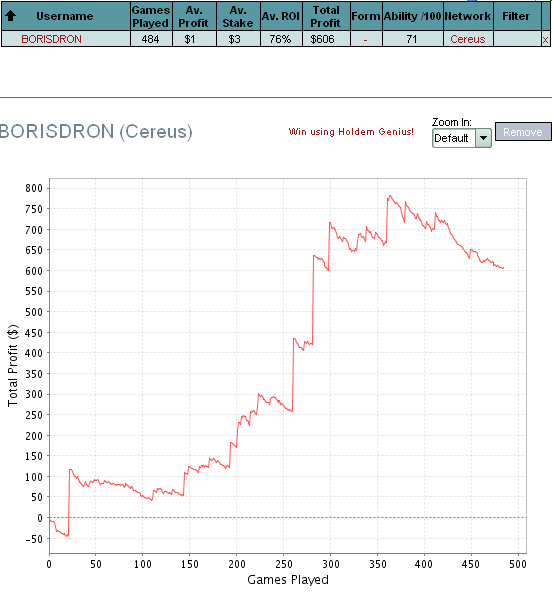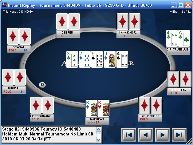 Месяц выдался очень тяжёлый.Даунстрик затянулся и мне неудалось плюсануть второй месяц.Мой бр получил значительную пробоину,в связи с чем пришлось немного откатиться по лимитам.Не сказал бы,что играл хуже ,даже ,как мне кажется лучше,но весь месяц меня приследует дикое невезение.Причём, именно в самых важных моментах.Хотя бы пару раз фортуна повернулась бы ко мне и был бы плюс ,но ...Также я обнаружил в своей игре "косяк",который надо срочно исправлять! У меня какая-то беда с средней стадией! Начало у меня в 80% очень хорошее,я набиваю стек топ 1-20 , но потом или неудачный блеф, или жёсткий переезд, или неудачно закрываю шорта. Теряю часть стека(где-то 20-30%) и всё!!! После этого игра идёт наперекосяк!Такое меня преследует весь месяц,из-за чего не было ни чего крупного,только ранние итм.Вообщем на этой стадии у меня проблемы,если кто,что посоветует буду признателен!Был и положительный момент ,наконец топ 1 (хотя и в маленьком турнире,но всё же)!!! Итак с Ultimate Bet буду прощаться,хотя зарекаться не буду,вдруг на оставшиеся копейки что-нибудь занесу))). Сделал кешаут 400$ (правда не знаю может меньше надо было делать,что-то снимается вроде).Как только прийдут на букерсы ,сделаю деп на Абсолют(там будет рейкбек).Буду продолжать оттуда,как я понял он абсолютно идентичен.Ещё очень хочу заиметь ПТ 3!!! I love this game