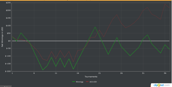 День 18Сегодня сыграл пару мтт, обидно вылетел в обоих, везде были хорошие стеки и пребабл. В биг55 против рега наверное