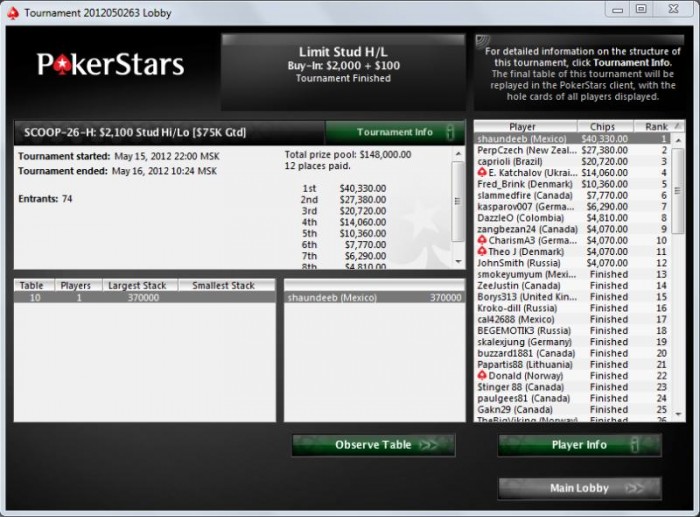 В ХА он вышел 120к против 250к соперника, через 7-10 сдач уже стало наоборот, потом выравнялись, а потом за 2 сдачи Шон практически оформил победу (они ниже под спойлером)