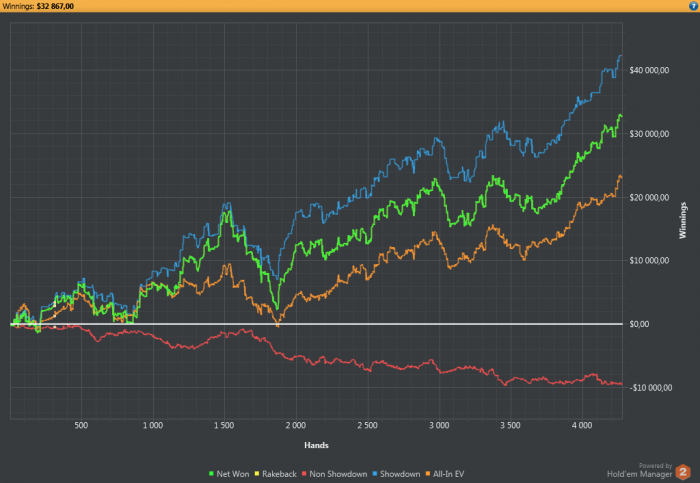 Hero shows (One Pair, Fives) (Pre 33%, Flop 24%, Turn 93%)