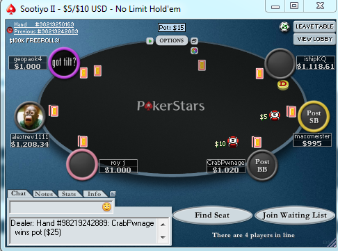 SB: $14.96 (VPIP: 13.17, PFR: 5.69, 3Bet Preflop: 1.71, Hands: 286)