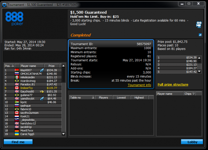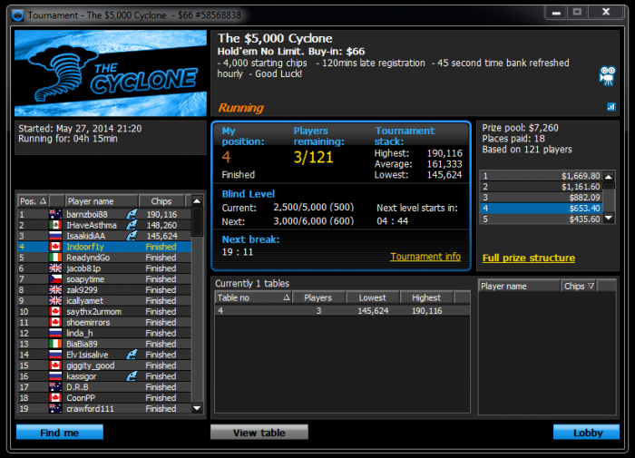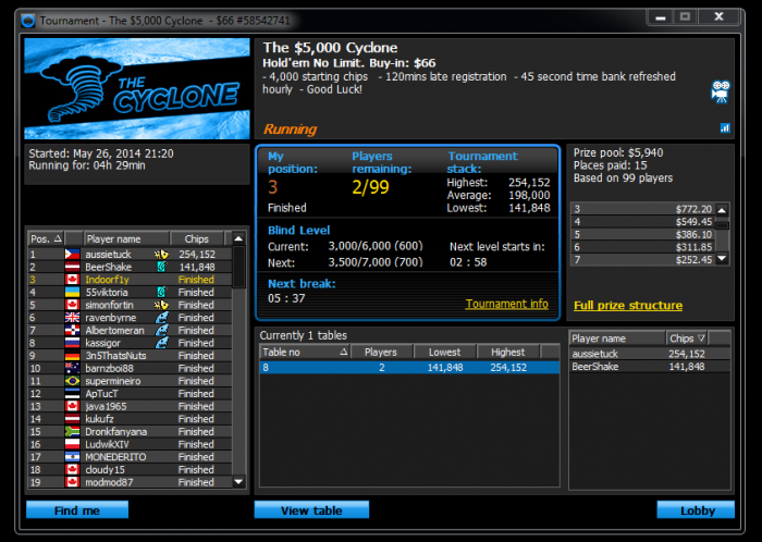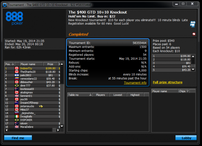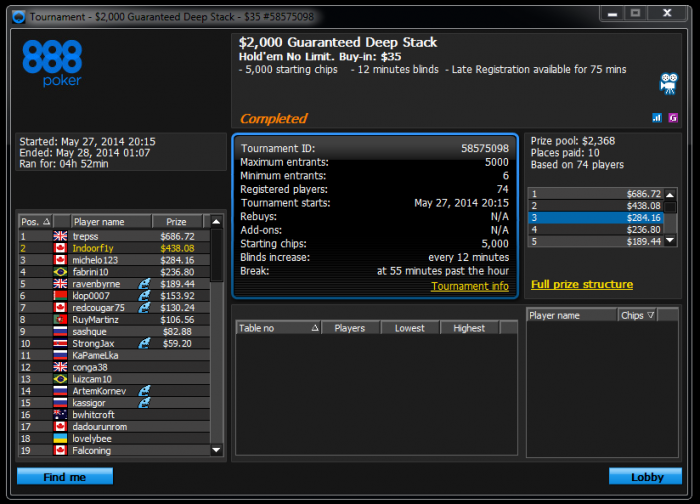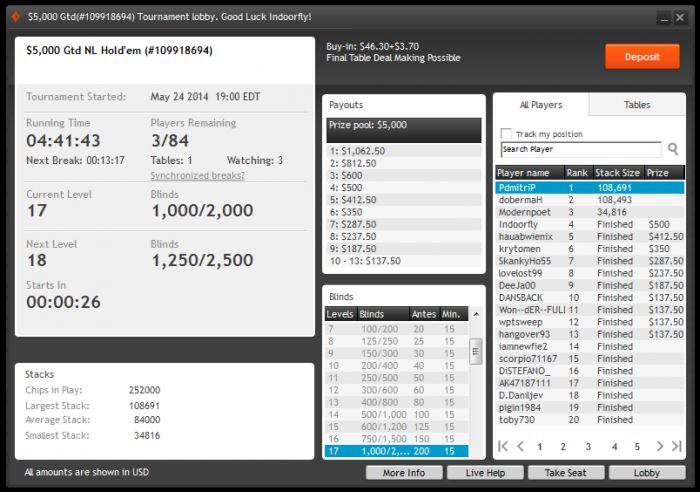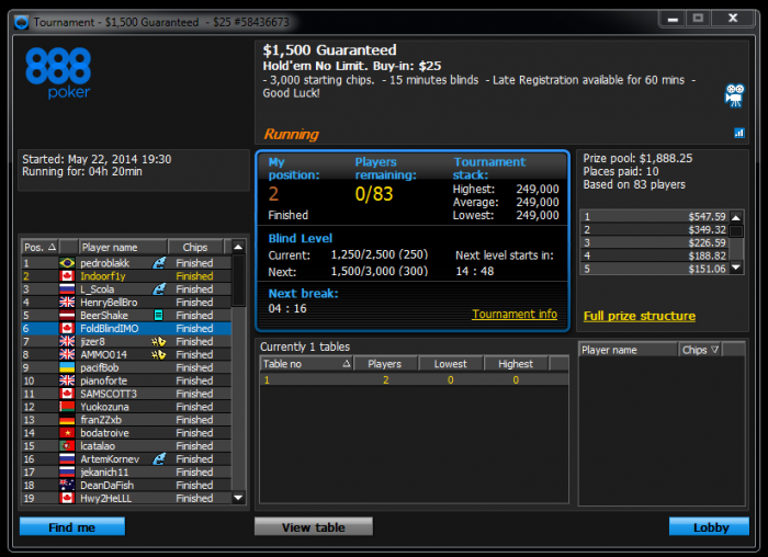 Party, $45.45 Buy-in (125/250 blinds, 25 ante) No Limit Hold'em Tournament, 7 Players