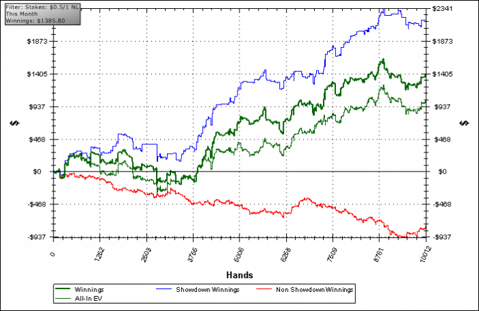 До апреля почти не играл МТТ, только с весеннего ФТОПСа начал катать их более-менее активно, т. е. можно сказать, что в месяц играется 100 турниров. Для МТТ-про маловато, но я в 1-ю очередь концентрировался на воскресных турнирах и не так много играл на буднях.