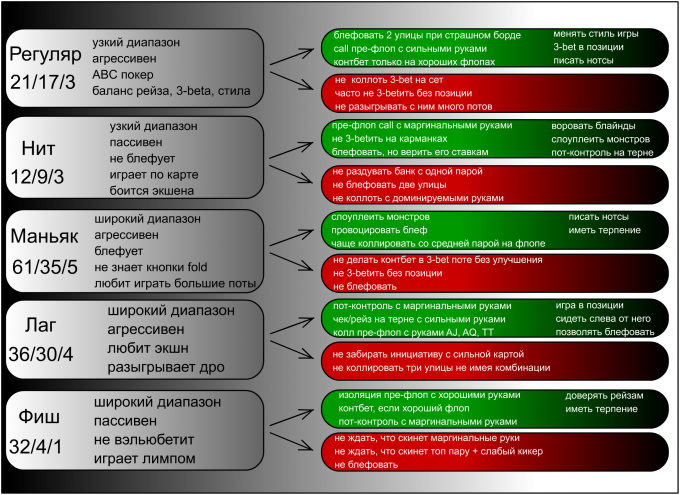 против ультратайта не будешь разгонять банк, будешь смотреть на рейзы по улицам, будешь играть более пассивно, даже с оверпарой лучше потконтролить. против агроманьяка (имнно маньяка, а не рега агрессивного) колить, возможно я и потеряю стек против сета, но выкидывать ТПТК или оверпару не стану, тк агроманьяк любит блефовать. в тоже время если он сделает чек, или чек бехайнд, я скорее буду внимательнее смотреть за его игрой и возможно поверю что я позади на большую ставку, но колл 1 улицы сделаю точно. тк слоуплей никто не отменял. плюс смотрим на воншд и ставки улицам.