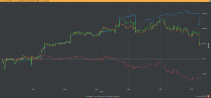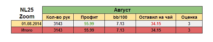 Как и обещал, выкладываю табличку с результатами вчерашнего дня. Отыграл 2 сессии, приблизительно по 1500 рук, играл неплохо, вдумчиво, но несмотря на это сделал довольно много ошибок. Ну и конечно вторую сессию я запорол знатненько, но там 2 кулера, один из них на раздутый стек, все в фирменном стиле. Ставлю себе 3 по 5 бальной системе