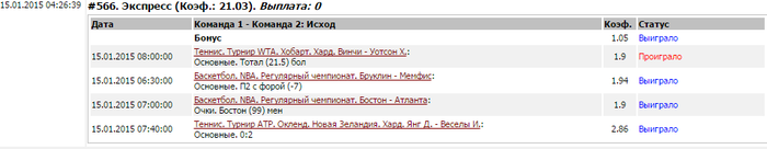 Вы же не думали, что один день в -1.5$к сможет сбить меня с колеи?)) Требовался отдых от блога и я его получил. Вместе с отдыхом пришел и профит. Сыграл в охуенный плюс два теннисных турнира ATP - Окленд и Сидней. Футбол практически не ставил,и профит по нему небольшой, так же как по НБА и НХЛ. Львиная часть профита пришла с одного дикого эспресса: