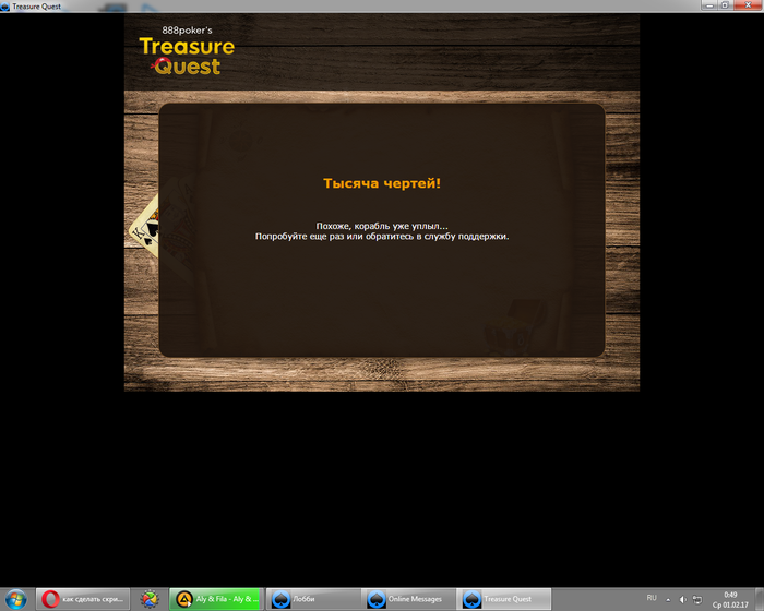 asus131 @ 30.1.2017 у меня проблемы в покере 888 не открывается карта и пише тысяча чертей карабыль уже уплыл как быть?мой ник asus131