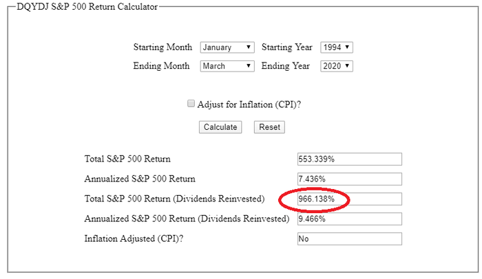 Да я хотел посчитать сколько бы я получил бы дивидендов если бы вложил 10000$ в 1994 году, и как отличался бы капитал если бы я снимал или не снимал бы дивиденды, хотел спросить есть какой-то калькулятор для этого