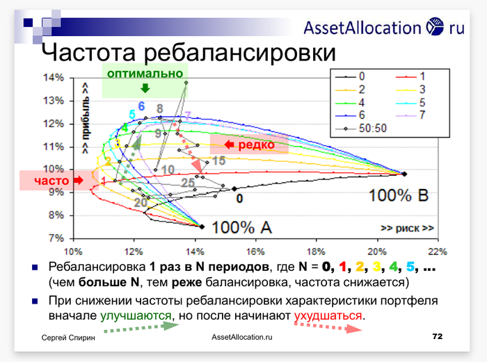 Сильное утверждение, есть какие-то доказательства? Чат инвесторов это слабое свидетельство, и замечу что утверждения "ребалансировка дает доходность выше S&P500"(которое вы обсуждали в чате) и "нет дополнительной доходности от ребалансировки" - разные. Первое я не буду защищать, согласен что диверсифицированные активы с балансировкой, вложенные на долгосрок в рынок US, в большинстве случаев проиграют S&P500 по доходности. Но во-первых проиграют немного, во-вторых хреново они диверсифицированны, если все активы связаны с US, а портфель с зарубежными активами может показать лучшую доходность. Позже напишу еще пост на эту тему. А теперь про ребалансировку и доп. доходность. Потратил два часа на сбор информации - в 2018 году(хоть и перевод) Сергей Наумов так же считает ребалансировку приносящей доп. прибыль(https://assetallocation.ru/boosting-returns-with-rebalancing/), но можно объяснить тем же бэктестом. Сергей Спирин десять дней назад написал про коронавирус - "Акции упали? Да и фиг с ними! Зато облигации продолжают приносить прибыль, а золото на фоне паники вообще растет, и эти колебания вполне компенсируют друг друга, приводя к постепенному росту общей стоимости портфеля. Выросла волатильность? Тем мощнее окажется портфельный эффект за счет плановых ребалансировок портфеля". Тоже считает полезным портфельный эффект, выложил график полезности ребалансировки(для российского рынка): Актив А - облигации, Актив Б - акции. На https://www.portfoliovisualizer.com/ все комбинации акции+золото(штук пятнадцать прогнал) показывают большую доходность с ребалансировкой, чем без нее. Стратегия 60/40(акции/облигации) показала доходность выше акций за двадцать пять лет(статья 2011 года, https://assetallocation.ru/rebalancing/). Исторические данные так себе аргумент, к сожалению мат. модели не нашел.