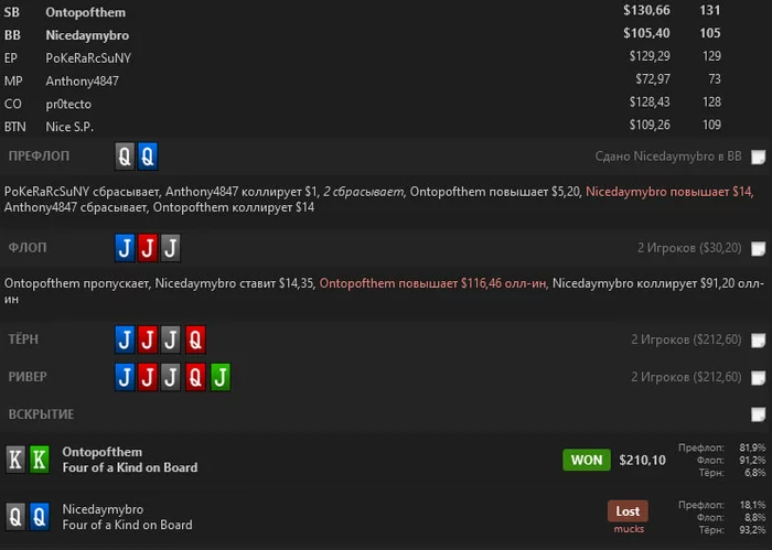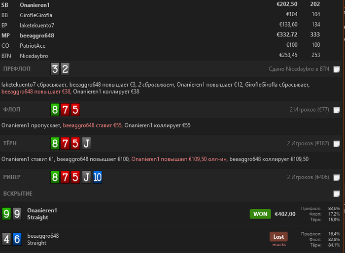Улыбнула сдачка, я даже хз что тут смешнее, что вип наролял себе такой флоп после 38бб 4 бета, или то что рег его так изящно уебал на 200 бобов. Это только на ред старе такое ей богу)))