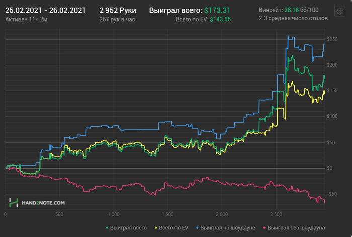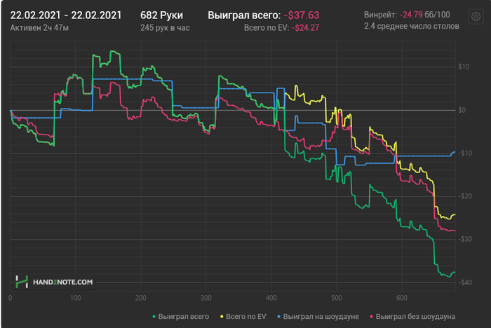 Февраль 2021Х2Н что-то очень много рук теряет , по кассам со всеми плюхами +730 и на покерке ещё +70 урвал в пушфолде