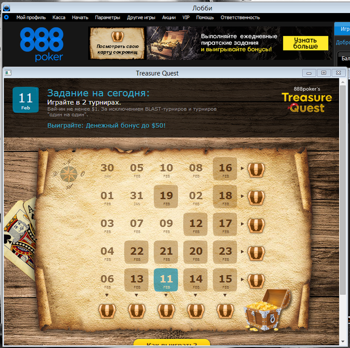 Ага, разобрался - верхний баннер и должен быть ссылкой на задание. Как я понимаю, теперь у большинства он будет блокироваться российскими провайдерами (белый прямоугольник вместо баннера или надпись ресурс заблокирован, если выбрать русский язык в клиенте). Планирует ли 888 что-то сделать в этом направлении, чтобы не было необходимости играть через VPN? Например, сделать онлайн дубликат как с Cashier, чтобы можно было через браузер открывать?