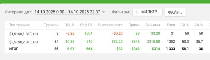 dimapokerny @ 15.10.25Но надо прокатывать-смотреть-считать стоит ли оно того. считай 25 турниров в час примерно получилось. чтобы отыграть 200 турниров надо 8 часов. по деньгам это 35 евро. И это очень мало, вот 350 бы-нормально было бы.