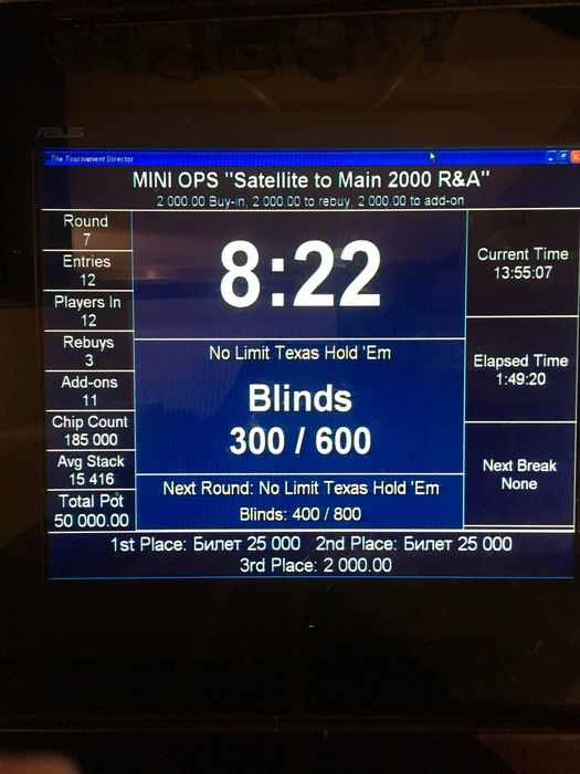 12:00 Turbo Satellite to Main Event в формате R&A по 2 000 руб. Гарантия 50 000 (2 билета) _ стартовый стэк 5 000 _ стэк на Rebuy 5 000 _ стэк на Addon 10 000 _ поздняя регистрация 6 уровней _ длительность уровней по 6*15/12 мин
