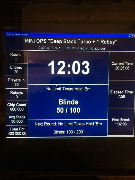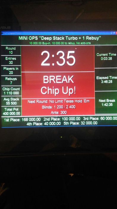 20:00 Deep Stack Turbo + 1 Rebuy по 10 000 руб Гарантия 400 000 руб _ стартовый стэк 30 000 _ стэк на Rebuy 30 000 _ поздняя регистрация и Rebuy период 10 уровней _ Rebuy можно сделать только один раз в любой момент и на любой стэк в течении первых 10 уровней _ длительность уровней по 20 мин