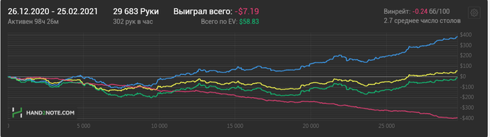 1. В период с 21 -28 число, то есть до конца февраля отыграть 8К рук (по 1000 рук в день, включая сегодняшний). Если не отыграю - переведу на счет 10 баксов одному из плюсанувших этот пост (для меня это ЦЕЛЫЙ БАЙ-ИН, так что всё серьезно :) )
