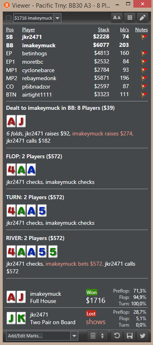 aspid301, Будет с раздачами , но сразу скажу, что в ICM играл просто ужасно, наверное только кик офф более менее, и то кучу ошибок наделал, а ребайник и дип за 7/5 вообще играл на отъебись . Короче сам виноват результат мог бы быть вдвое лучше.