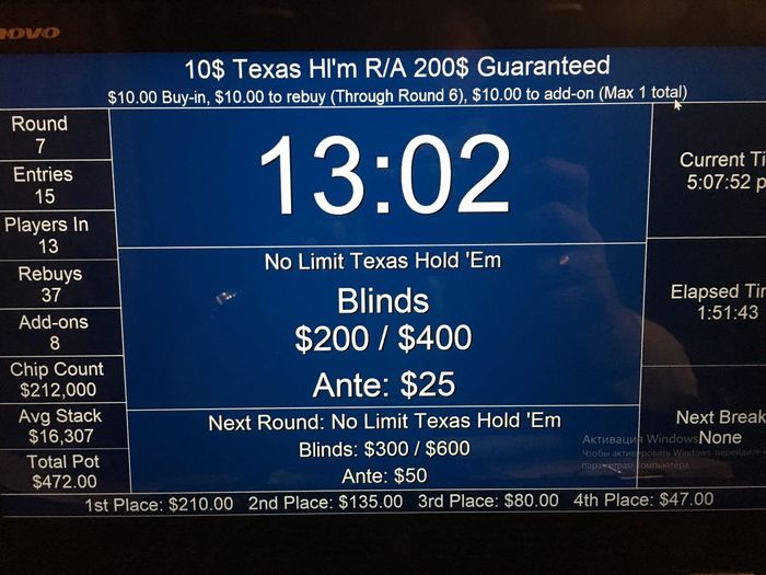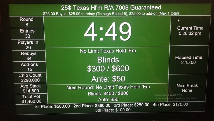И снова дневной турнир порадовал посещаемостью и призовыми. 33 участника «наколотили» 1460$ призовых! Пятое место занял Щербинин Евгений (100$). Оставшись четвёртом (Шепель Дмитрий, Кубраков Алексей, Сучков Станислав, Маковский Егор), было принятое решение поделить поровну (340$). Победителем стал Шепель Дмитрий!