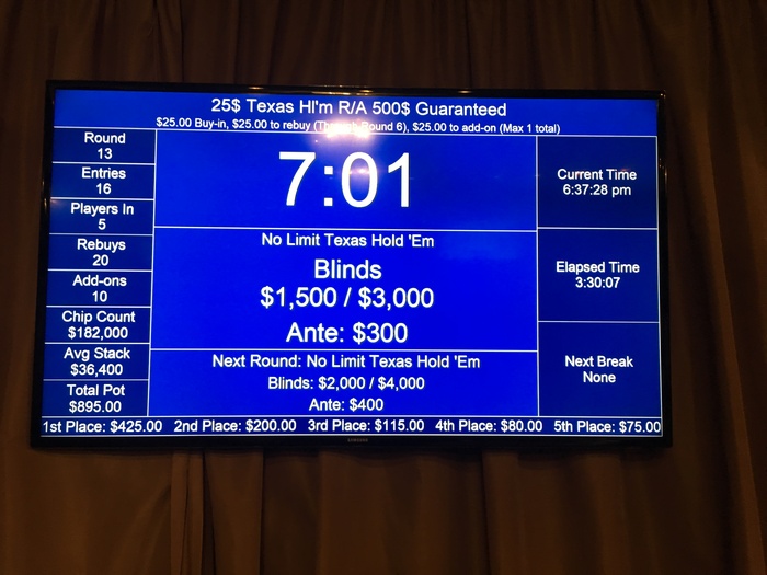 Сегодняшний турнир можно смело называть FREEROLL. Из 19 участников 10 воспользовались правом на бесплатный стартовый стек, так как впервые посетили наш клуб! Сейчас играет финалка. Параллельно уде стартовали два кэш стола Holdem и Omaha. Совсем не кого времени осталось до розыгрыша новенького iPhone 8! Угощать наших гостей будем куриными нагетсами в сырном соусе от шеф повара ресторана Grand Bellagio!