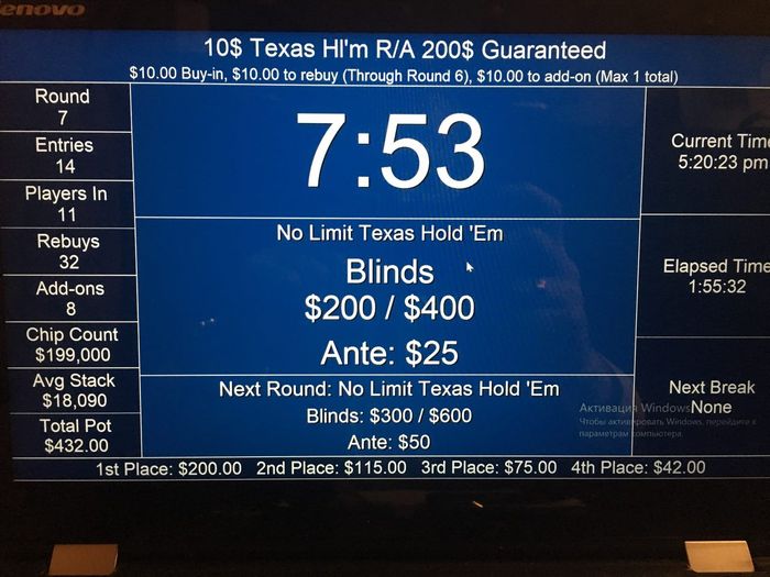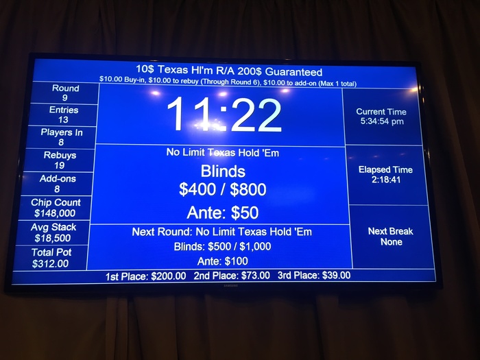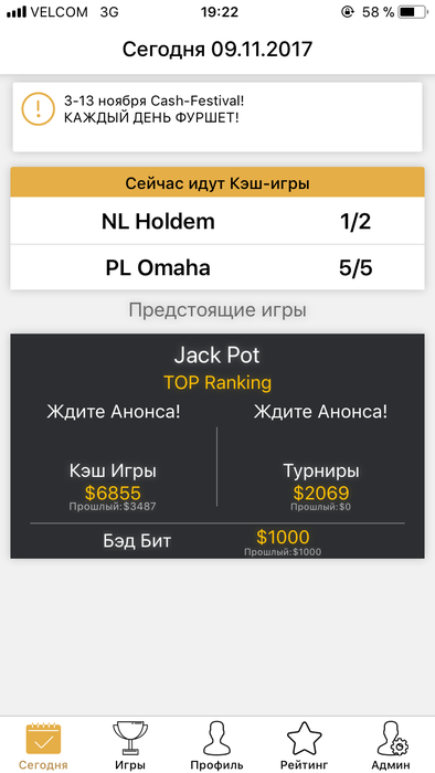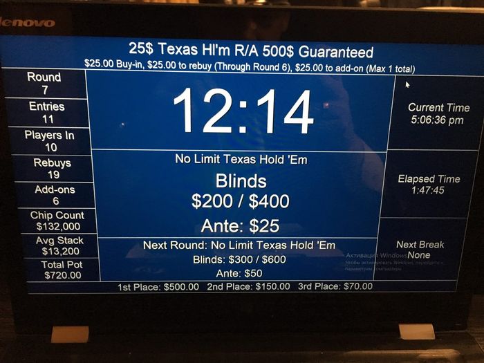 Вчерашний вечер отметился очередным аншлагом. Все три стола играли до утра. Сейчас играют турнир 25$ Texas Hl’m. Параллельно стартовал кэш 1/2$ Holdem и 5/5$ Omaha
