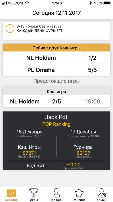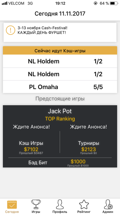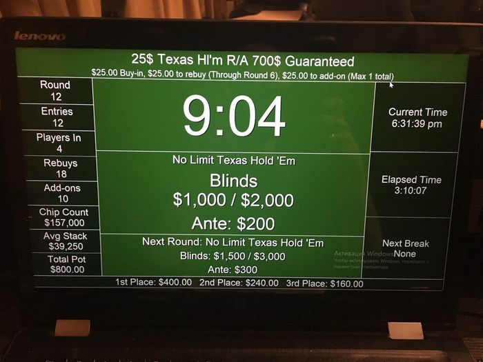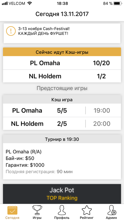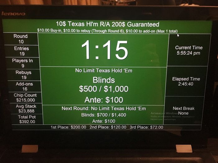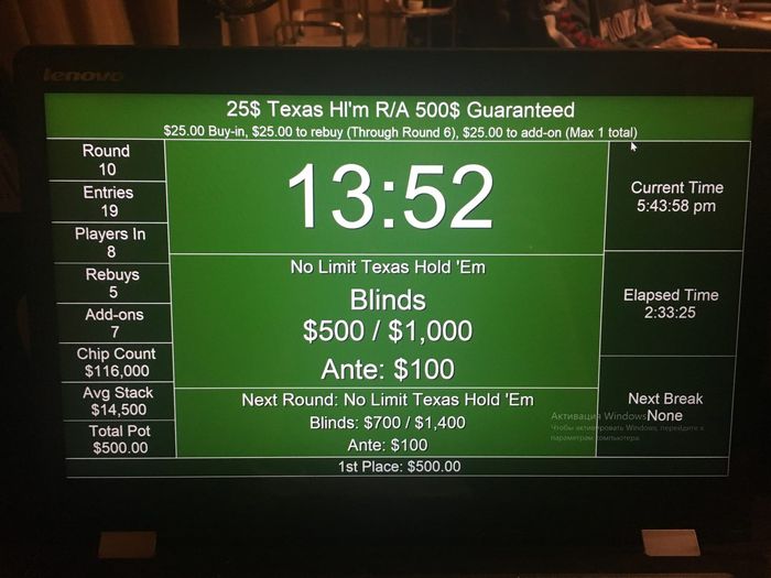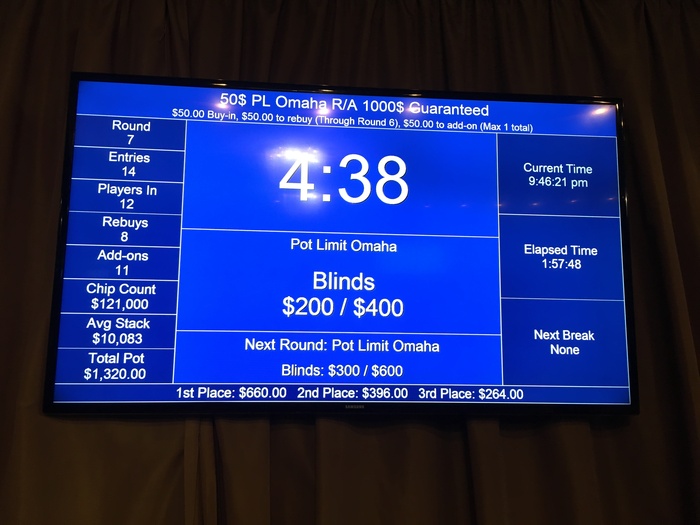Несмотря на то что наш фестиваль подошёл к концу, наши гости не собираются расходиться. Со вчерашнего дня играет PL Omaha. Прошёл дневной турнир. 19 человек (из них 5 первых визитов) собрали 392$. Через час начнётся турнир 50$ PL Omaha 1000$ GRNTD.