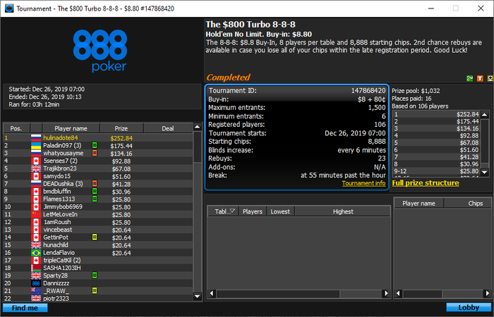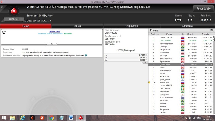 Данным комментарием хочу выразить слова благодарности своему тренеру Юрию Ремизову за знания, которые он мне передал, за честное отношение к делу и детальный подход. Обучение завершилось ещё в мае прошлого 2019 года. Значительные улучшения в игре и, как следствие, первые победы не заставили себя долго ждать - в июне-июле на пати покер 1-е место в баунти турнире за 4.40$ и 4-е место в регулярном турнире за 11$, а также несколько заносов на крупные суммы на 888 в bigfish за 5.5$ и 16$. К сожалению, из-за неправильного банкролл-менеджмента с моей стороны, мой банкролл спустился почти до 0. Так что пришлось взбираться на гору заново=) Отзыв пишу только сейчас поскольку ждал нового крупного заноса. И этот день наступил - на прошлой неделе я занял 2е место на pokerstars в баунти-турнире Winter Series за 22$. Хочу сказать, что помимо везения на 99% заслуга в победе лежит на Юрие - только благодаря знаниям и навыкам, которые я получил на его тренировках, позволили показать такой уровень игры. Планирую и дальше пользоваться его услугами для улучшения навыков. Резюмируя, хотел бы сказать, что если вы своей стороны будете выполнять все задания и установки Юры, уделять должное количество времени теории и тренировкам, то результат не заставит долго себя ждать. Плата за обучение с лихвой будет отбита через несколько месяцев.