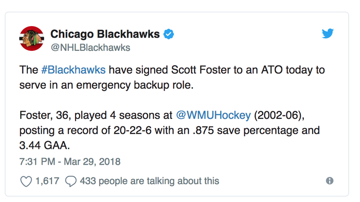 На играх НХЛ присутствуют обычно 20 игроков, в том числе два вратаря. Если у основного вратаря вдруг возникают проблемы со здоровьем до или во время игры, его заменяют запасным вратарем. В последний момент у третьего вратаря пошли судороги и с большой вероятностью он бы не смог заменить двух основных голкиперов если вдруг что. Вот в таких случаях клубы НХЛ заключают договор всего на одну игру с местным вратарем из любительской команды, что и сделало Чикаго Блекхокс