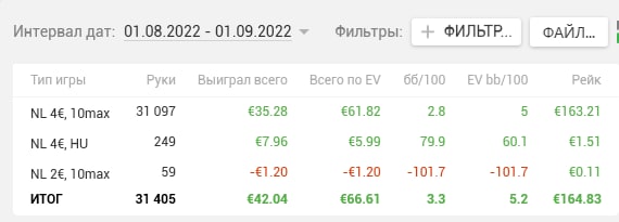 На сентябрь в планах тоже не так много игры с учетом отпуска и т.д. Всего 78 часов, но надеюсь БР в конце месяца вырастит до 40БИ NL10 и в октябре переберемся туда. Не смотря на достаточно посредственные результаты чувствую преимущество над полем и даже не сомневаюсь, что бью данный лимит с запасом, при конском рейке в районе 12bb/100