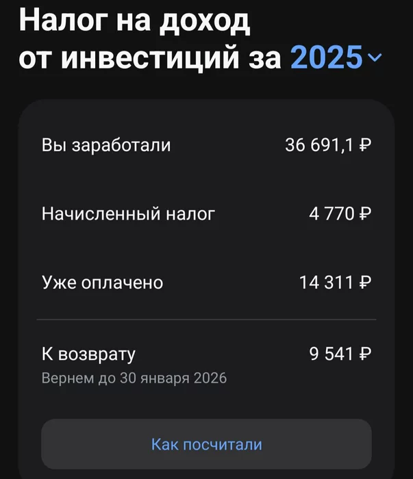 Кстати, Тинькофф налог за 2025 год плюс/минус правильно рассчитал.