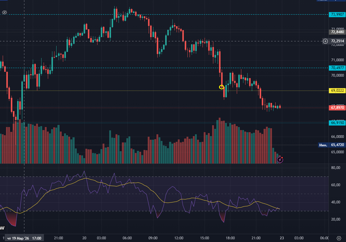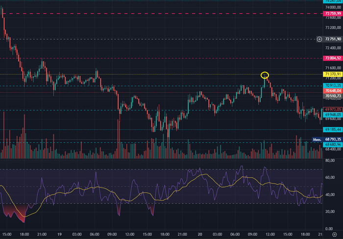 Актив вошел в зону перекупленности. Сверху есть небольшой уровень сопротивления желтая линия). Усреднялся бы перед более сильным и давним уровнем сопротивления в районе 72к (малиновая линия над желтой), стоп за этим же уровнем (при закреплении над 72к). Т.е. здесь такая же ситуация как с первой сделкой, только там в лонг, здесь в шорт.