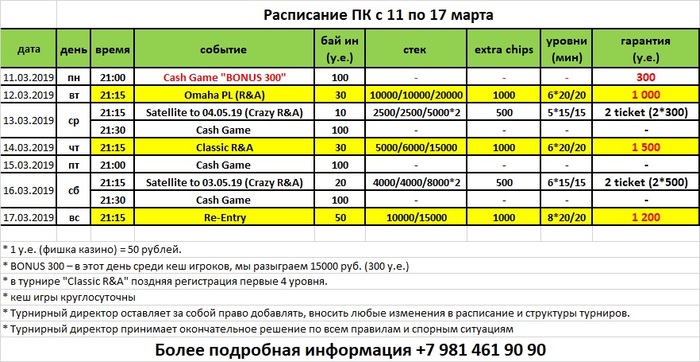 Дорогие друзья! Держите расписание ПК 11-27 марта. Обратите внимание: 1) сегодня в понедельник сбор всех кеш игроков, как обычно мы разыграем среди участников 15.000 рублей. Начало мероприятия в 21:00. 2) во вторник турнир «Omaha PL» Стоимость участия 30 у.е. Гарантия 1 000 у.е. Ждём всех желающих! 1 у.е. = 50 руб.