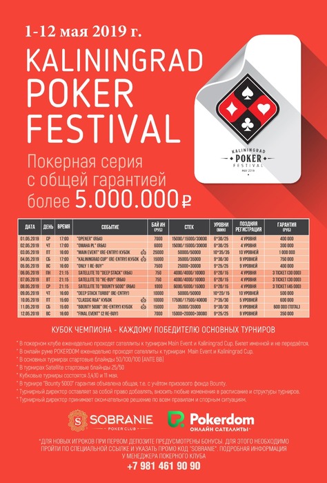 Дорогие друзья! Спешим представить Вам очередной Покерный фестиваль с общей гарантией более 5.000.000 рублей. И не изменяя своим традициям, мы запускаем сателлиты: 1) каждую среду в Покерном Клубе - сателлит к турниру 4 мая «Kaliningrad Cup» 2) каждую субботу в Покерном Клубе - сателлит к турниру 3 мая «Main Event» 3) с 18 марта запускаются онлайн сателлиты на Pokerdom к турнирам «Main Event» и «Kaliningrad Cup». Pokerdom для новых игроков при первом депозите предусматривает определённые БОНУСЫ. Для этого необходимо зарегистрироваться по специальной ссылке и ввести определенный промо код. Более подробная информация: +7 981 461 90 90 (звонок, what’s up и Viber)