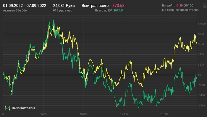 Но на этой неделе из-за объемов катки и работы поплыл в одной сессии. Очень мощно начал в первые дни, ожидания завысились, откатал первую дефолтную, в которой 4 раза не выиграл all-in с тузами. Слегка подгорел, но мне показалось что перерыва будет достаточно для восстановления. И ошибся. Сел за вторую сессию, хороших фишей не было, но было 2 типичных чиковских клоуна со статами 35-17-14, с оверагрессией и оверколлом постфлоп. Еще и на 4 столах каждый играл. И вместо того, чтобы играть в свою игру, я решил переиграть этих ребят на их же поле. Начал трибетить пол-ренжа против них и залетать под их 3 беты со всякой херней. Собственно закономерно был наказан.
