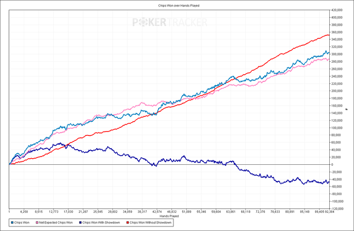 С EV, рейкбеком (недельными микрогонками, релоадами и прочими бонусами) вышло за эту дистанцию примерно 1600-1700$. В пересчете на почасовку или кол-во рук выходит пока сильно выгоднее, чем выходило на старзовских пятерках (там на 5к турниров\100 000 рук было ~1500$). И это я еще форму не набрал и чарты под анте в глаза не видел.